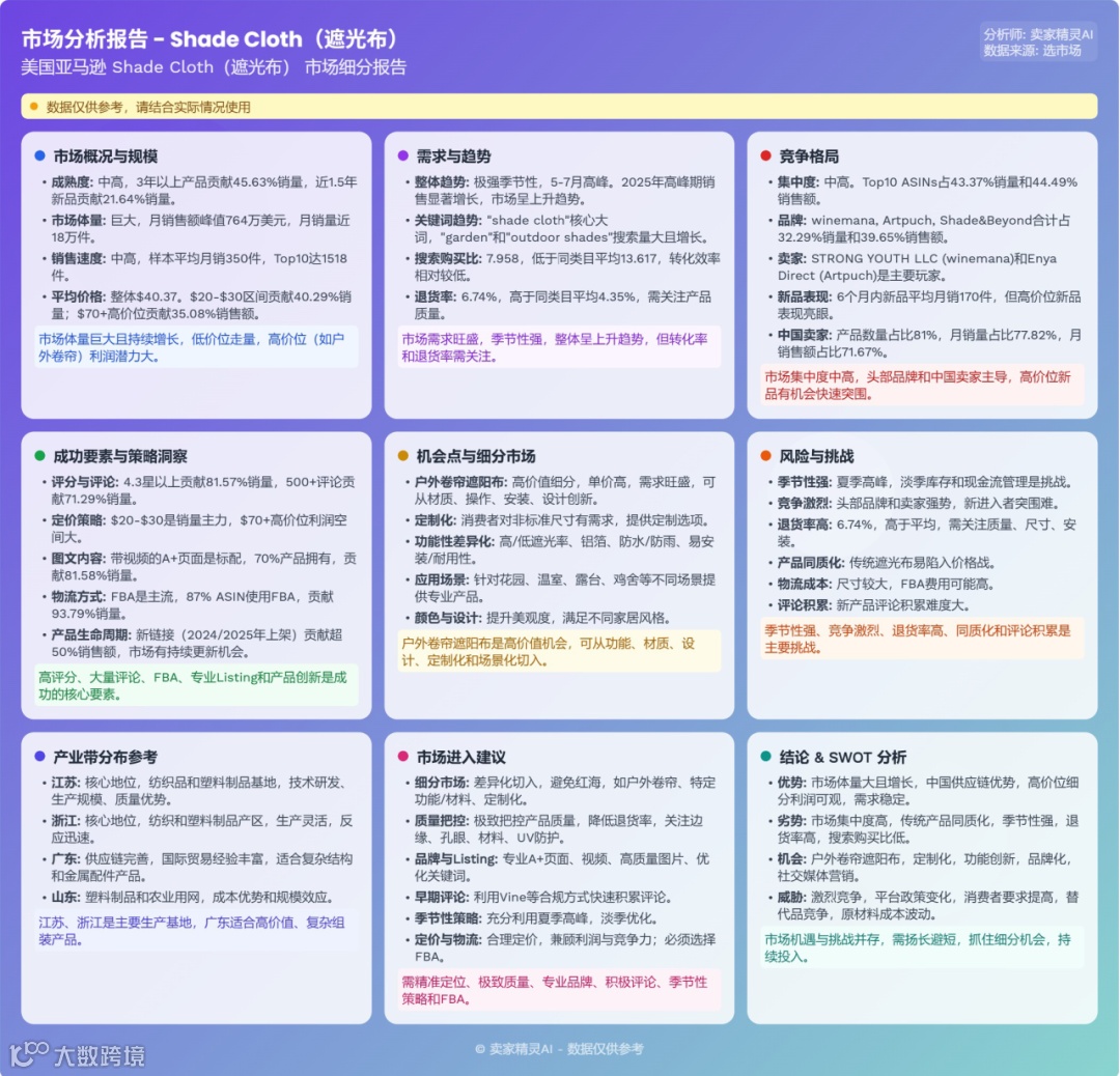 美国亚马逊Shade Cloth(遮光布)市场规模庞大、季节性强、持续增长。传统低价遮光布走量,高价值户外卷帘遮阳布贡献显著销售额,强势品牌与大量中国新卖家并存。