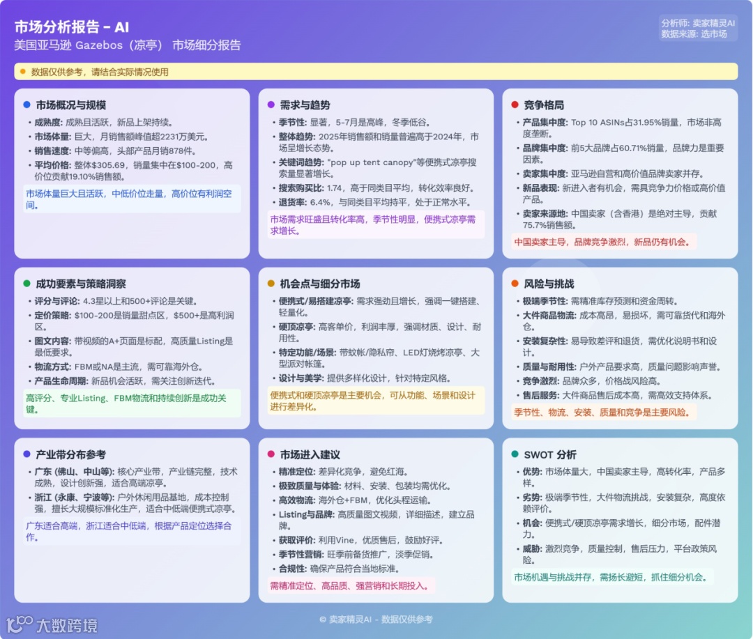 中国卖家在产品创新、成本控制与物流优化方面具备显著优势。但凉亭属大件商品,对质量稳定性、安装便捷性、物流时效与售后服务要求更高。成功关键在于精准定位、严控品质、优化大件履约方案,并持续投入品牌建设与用户口碑积累。