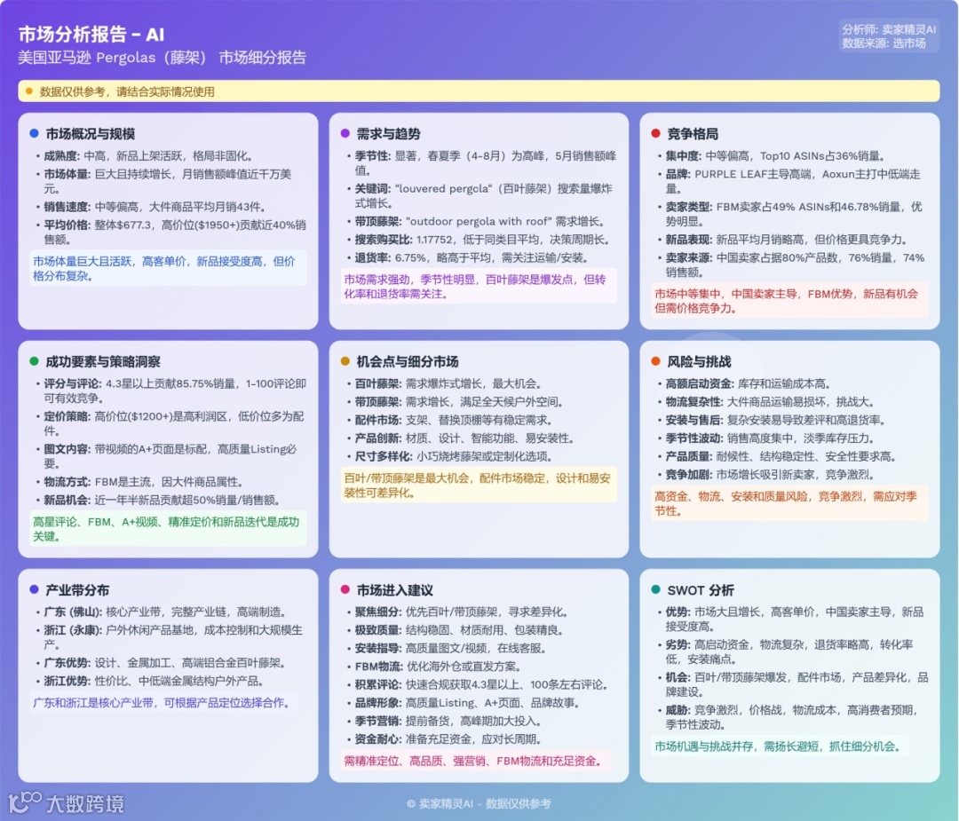 美国亚马逊Pergolas(藤架)市场呈现显著增长、高客单价、强季节性、中国卖家主导等特征。除整装结构外,配件与替换件亦具稳定需求。因产品特性(大件、高价),FBM(卖家自发货)模式占比较高,为中国卖家提供灵活运营空间。