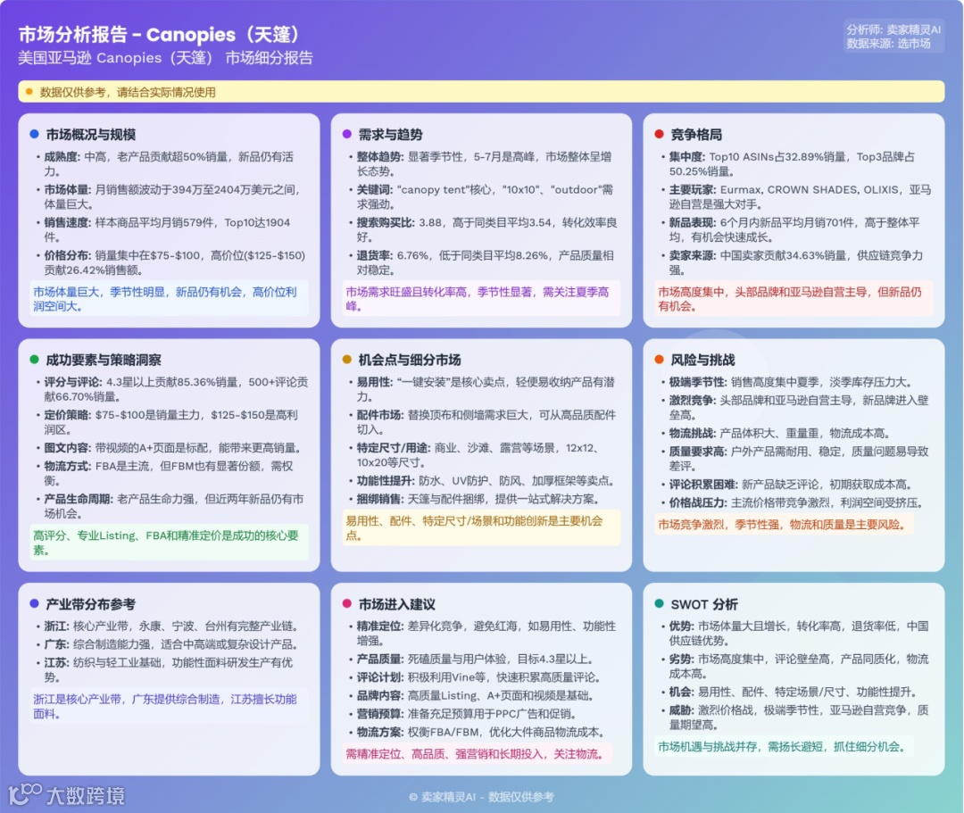 美国亚马逊Canopies(天篷)市场体量大、季节性强、竞争激烈,由少数头部品牌和亚马逊自营主导。产品类型丰富,涵盖完整天篷、替换顶布及侧墙等,新进入者仍有机会。