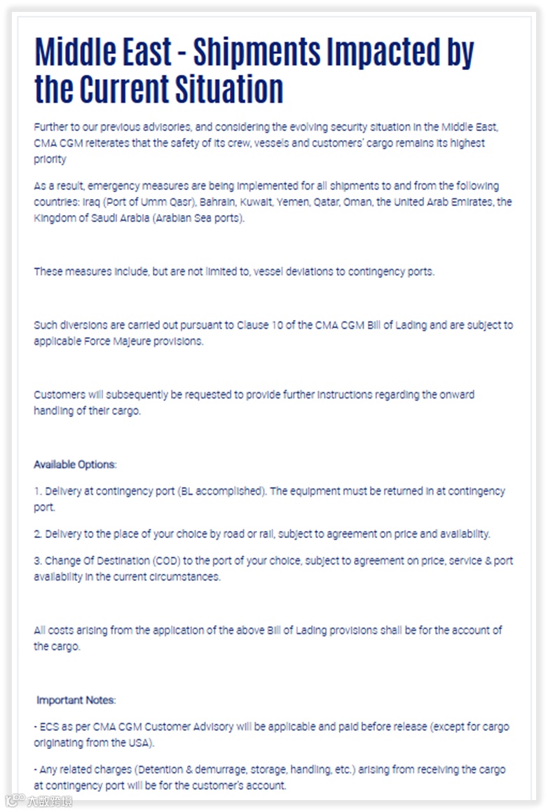 达飞轮船(含ANL品牌):对乌姆盖斯尔港、巴林、科威特、也门、卡塔尔、阿曼、阿联酋及沙特阿拉伯等港口相关货载,启动船舶改道、紧急卸货等措施,并明确依不可抗力条款执行。客户可选择临时港口交货、陆路/铁路转运或更改目的港,但滞期费、滞箱费、港口处理费、仓储费、改港费及转运费等均由客户承担。