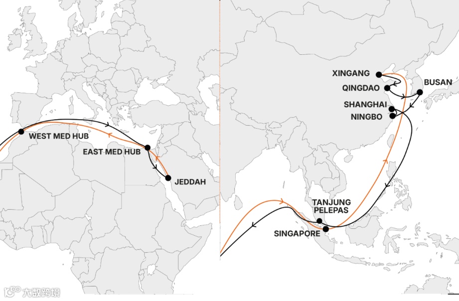 在暂停部分中东服务的同时,班轮公司加快重构区域网络。马士基与赫伯罗特依托“Gemini Cooperation”合作框架,联合推出亚洲—地中海新航线AE19/SE6,挂靠沙特红海港口吉达,以规避霍尔木兹海峡风险。该航线挂港顺序为:天津—青岛—釜山—宁波—上海—丹戎帕拉帕斯—西地中海枢纽港—东地中海枢纽港—吉达—东地中海枢纽港—西地中海枢纽港—新加坡—天津,首航船为13,500TEU的Maersk Elba,计划于3月13日自天津开航。