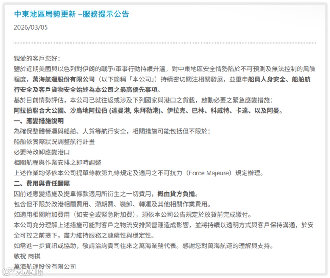 万海航运:自3月5日起对阿联酋、沙特(达曼港、朱拜勒港)、伊拉克、巴林、科威特、卡塔尔、阿曼等地货载启动紧急应变措施,包括调整航行计划、备用港卸货等,全部依据提单第9条及适用不可抗力条款执行。所有相关费用(含安保附加费、紧急附加费)须于货物放行前结算完毕。
