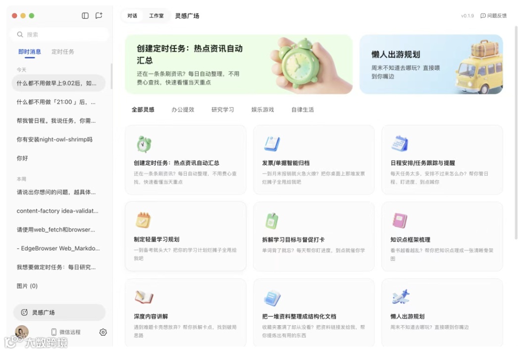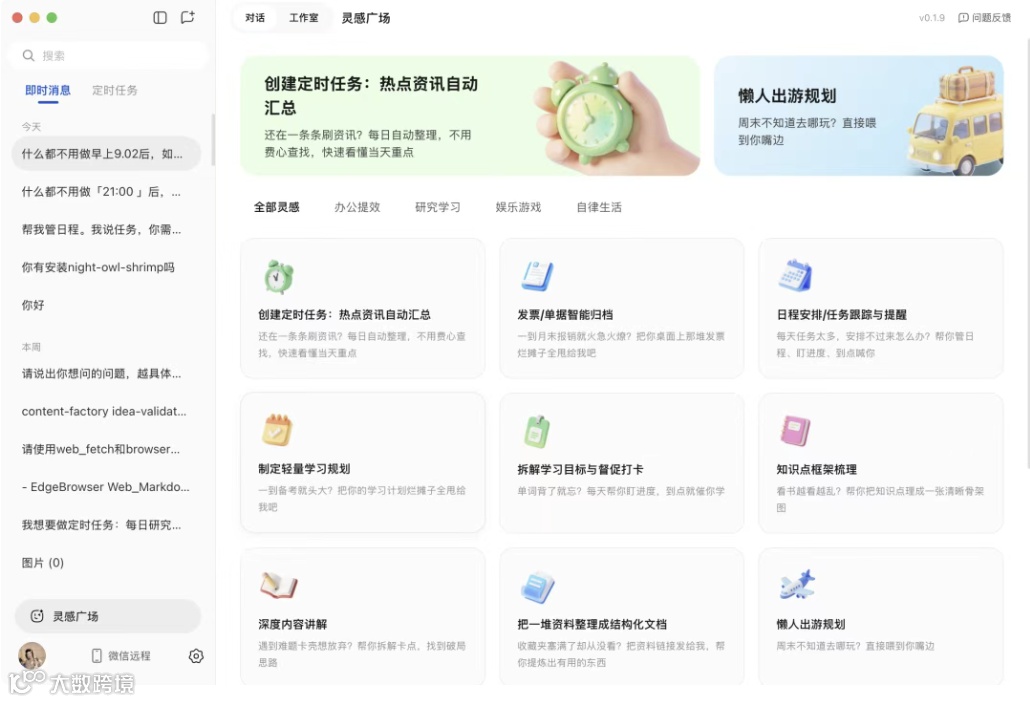 【Skills能力】完整兼容OpenClaw技能包,“灵感广场”预置定时任务、日程提醒、文件整理、远程办公等高频Skill。
