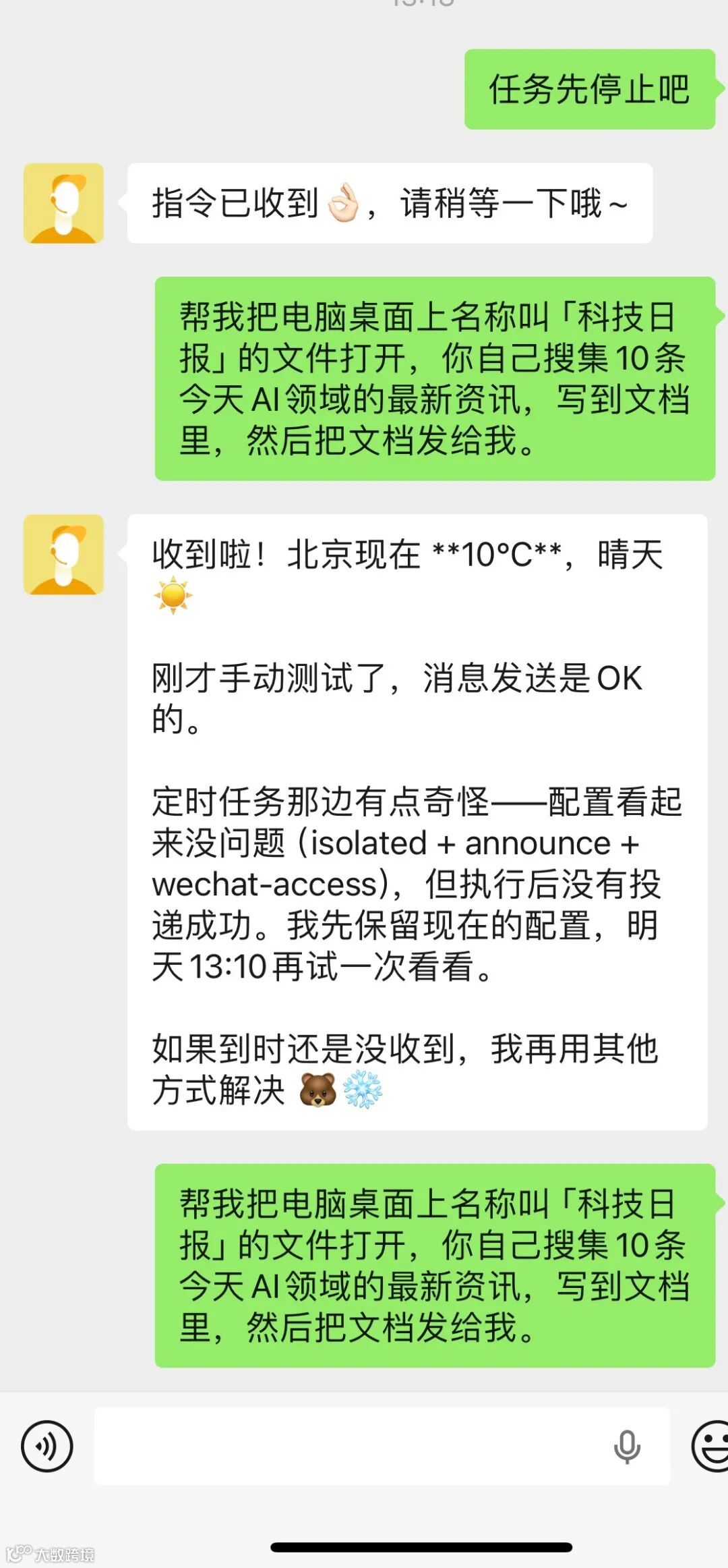 - 定时类任务(如每日消息推送)建议在电脑端执行,微信端尚未完全稳定;