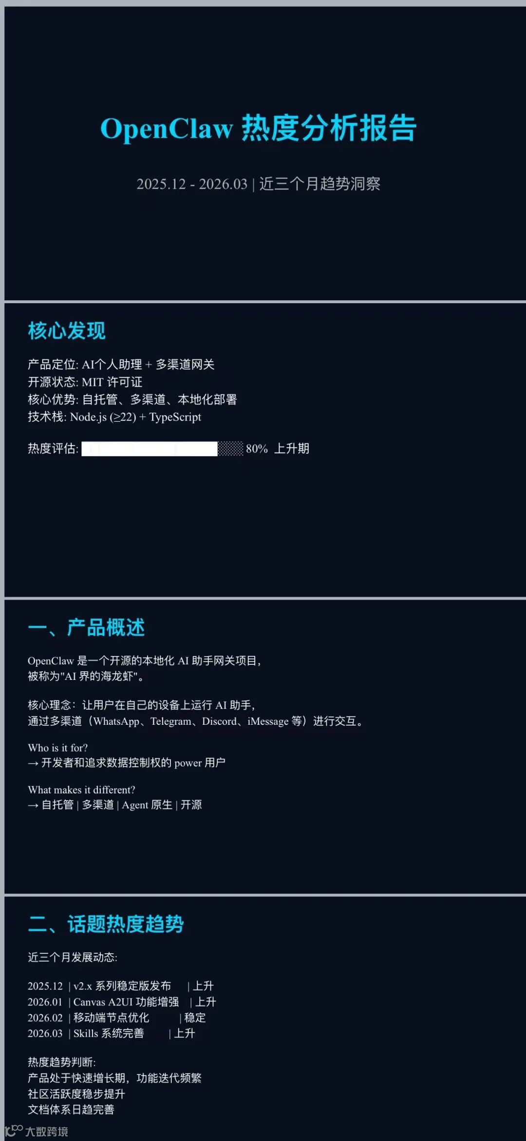 生成一份近三个月OpenClaw热度分析报告,包含话题热度趋势、国内外相关产品、用户讨论关键词,以及整体趋势总结与判断,科技感视觉效果、偏调研分析风格。