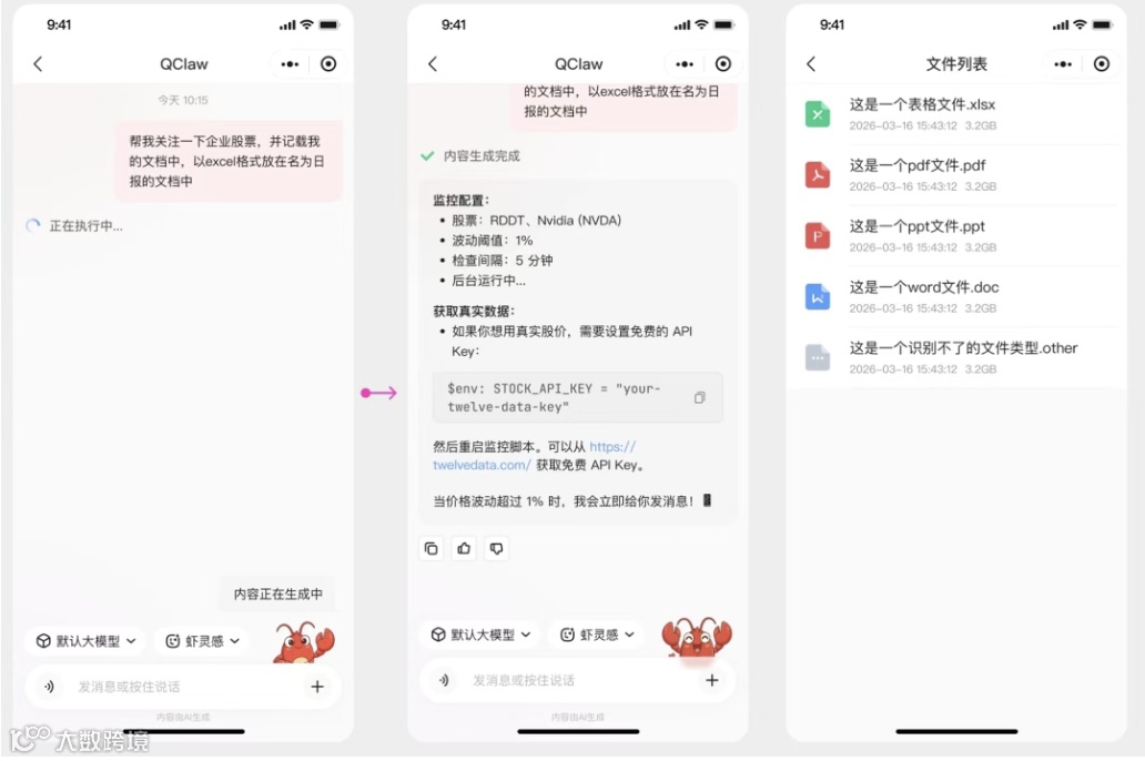 模型方面,QClaw内置默认推理模型,亦支持用户通过API切换私有或第三方大模型。