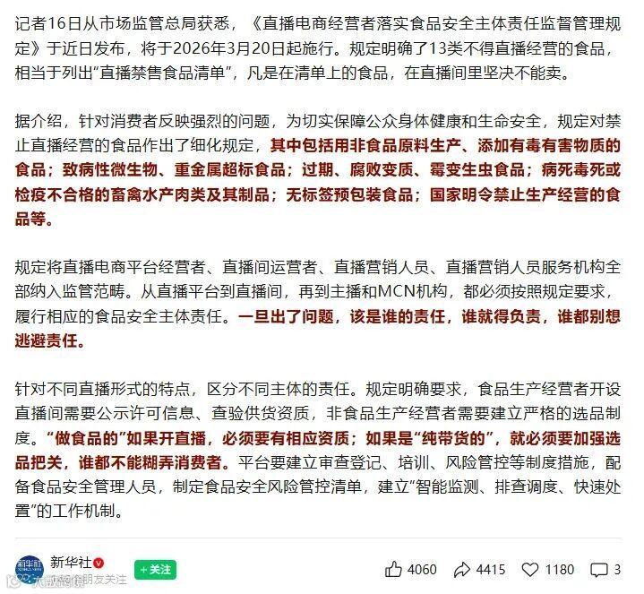 今年1月,《直播电商经营者落实食品安全主体责任监督管理规定》正式施行,首次将直播平台、直播间运营者、主播及MCN机构全部纳入食品安全责任主体范围,明确各环节须履行审核把关义务。