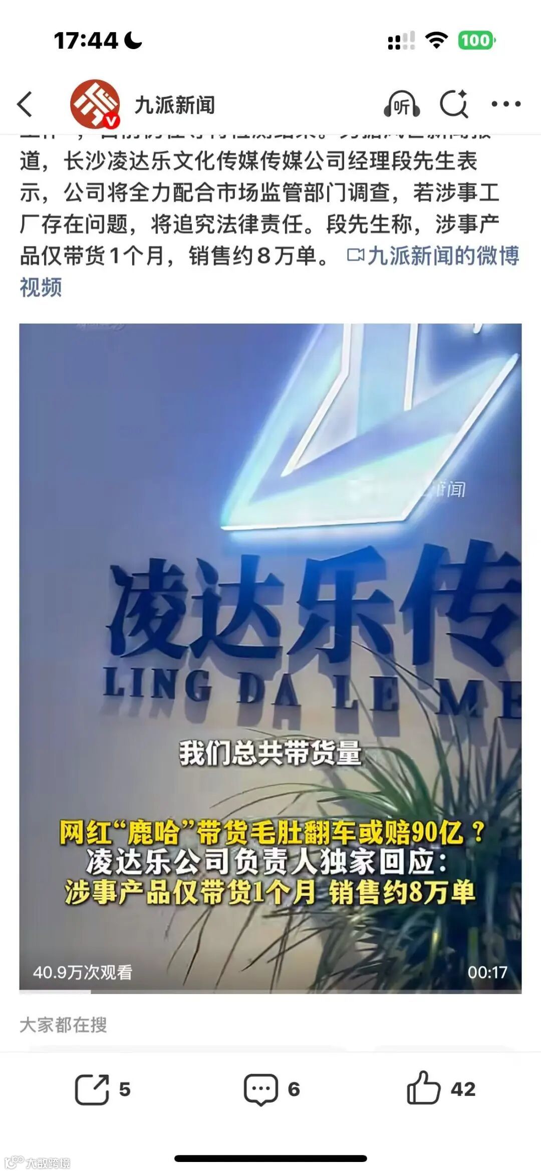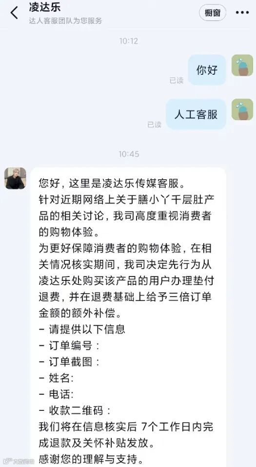 凌达乐客服回应称,将为消费者先行退款,并额外补偿三倍订单金额。其负责人随后澄清:3000万单为全品类带货总量,涉事毛肚单品销量为8万单。