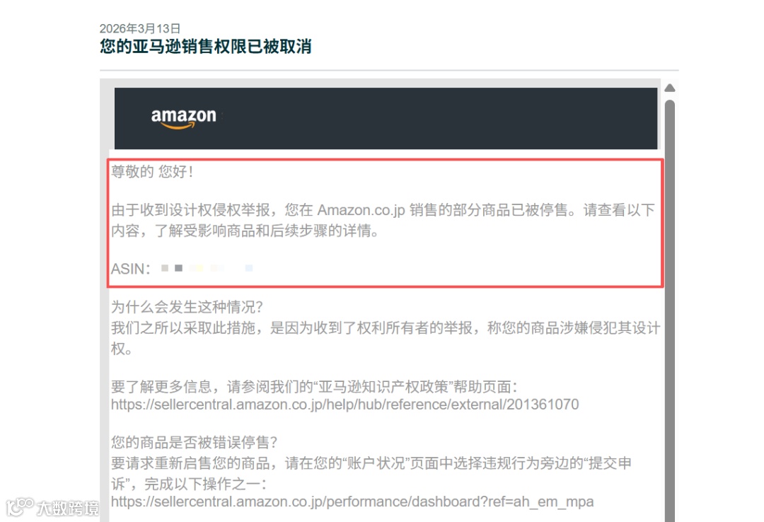 由于收到设计权侵权举报,您在Amazon.co.jp销售的部分商品已被停售。请查看以下内容,了解受影响商品及后续处理流程。