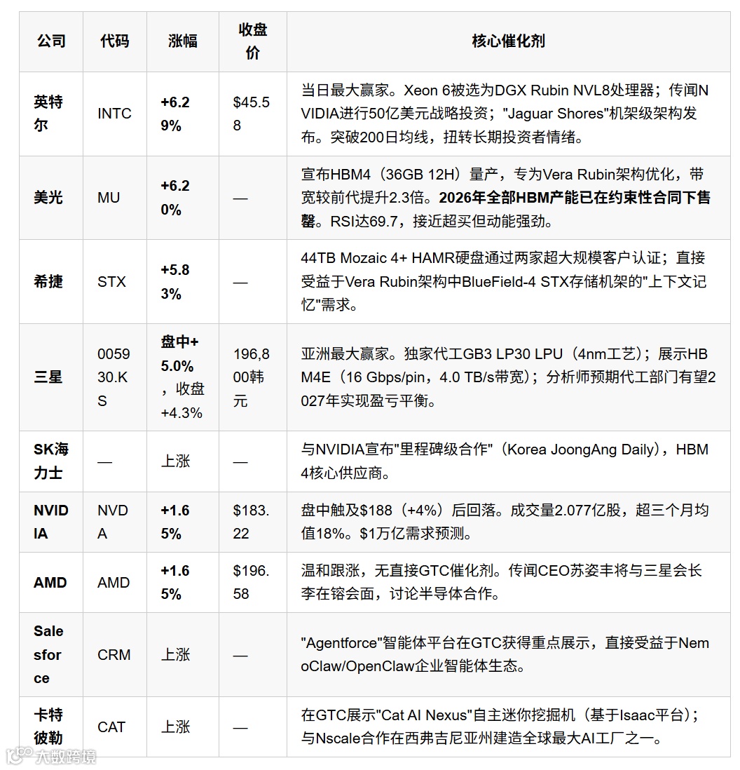 最显著现象:NVIDIA自身涨幅(+1.65%)显著落后于供应链伙伴:英特尔(+6.3%)、美光(+6.2%)、希捷(+5.8%)、三星(+5.0%)。