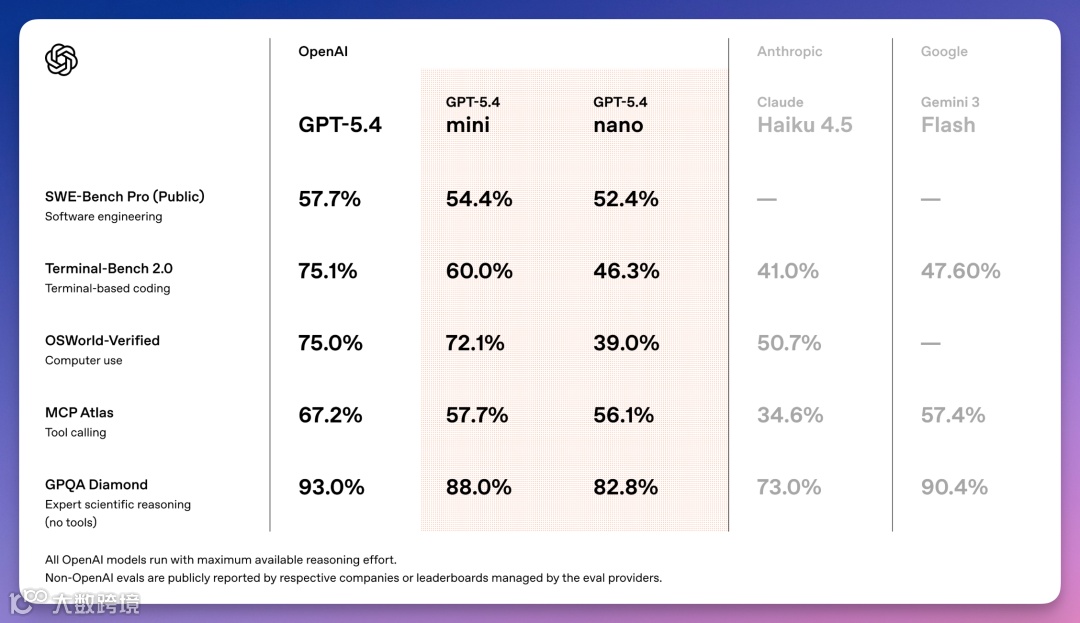 OpenAI本次发布强调性能与成本双重优势:横向超越前代GPT-5 mini,纵向对标Anthropic Claude Haiku 4.5与谷歌Gemini 3 Flash。