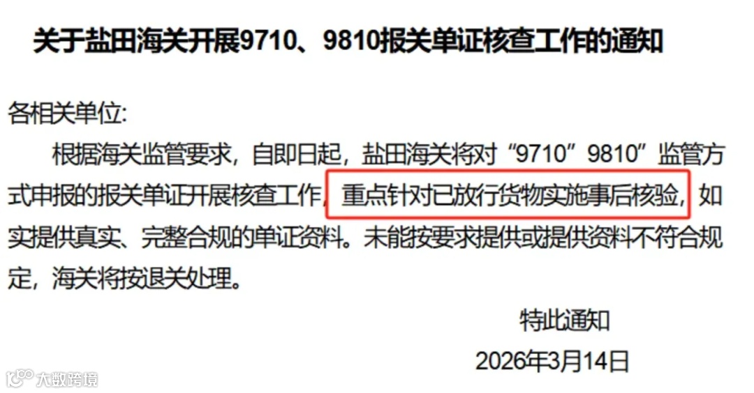 盐田口岸近期启动9710(跨境电商B2B直接出口)、9810(跨境电商出口海外仓)业务专项核查,打破“重放行、轻事后”的传统模式,落实“前端便利化、后端穿透式核验”的监管逻辑。