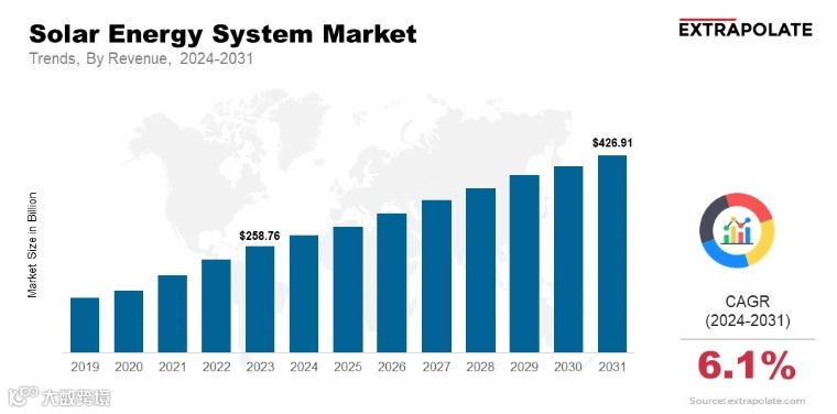 全球太阳能系统市场预计2031年达4269.1亿美元,未来五年复合年增长率约6.1%。政策支持、环保意识提升与技术成熟共同驱动该赛道稳健增长。