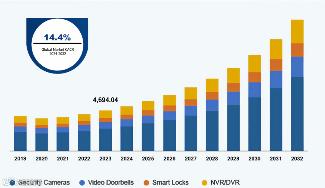 全球家庭监控市场规模预计2032年突破500亿美元,未来六年复合年增长率近15%。