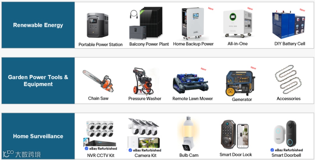 可再生能源与储能(Renewable Energy)、家庭安防(Home Surveillance)、园林动力设备(Garden Power Tools & Equipment)。