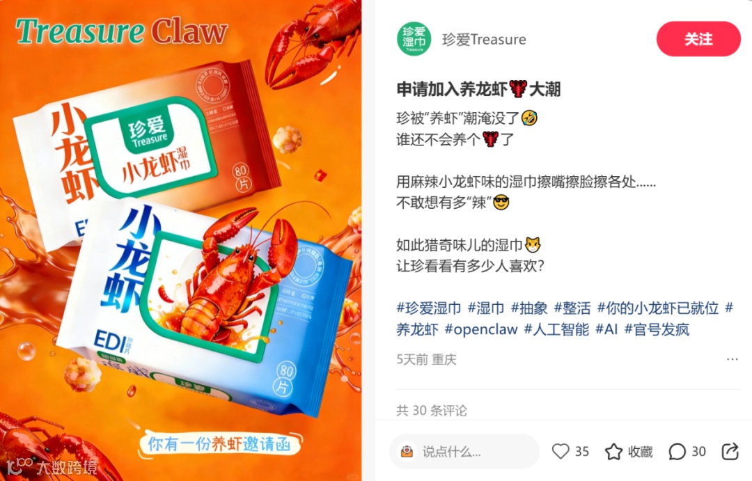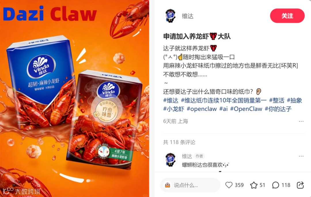 品牌快速响应:一类是技术型入局者,如字节跳动、腾讯、京东、小米、华为、阿里等,推出自研AI智能体;另一类是非技术品牌,借势玩梗——维达、珍爱湿巾高调宣布“申请加入养龙虾大队”,以猎奇表达强化传播记忆。
