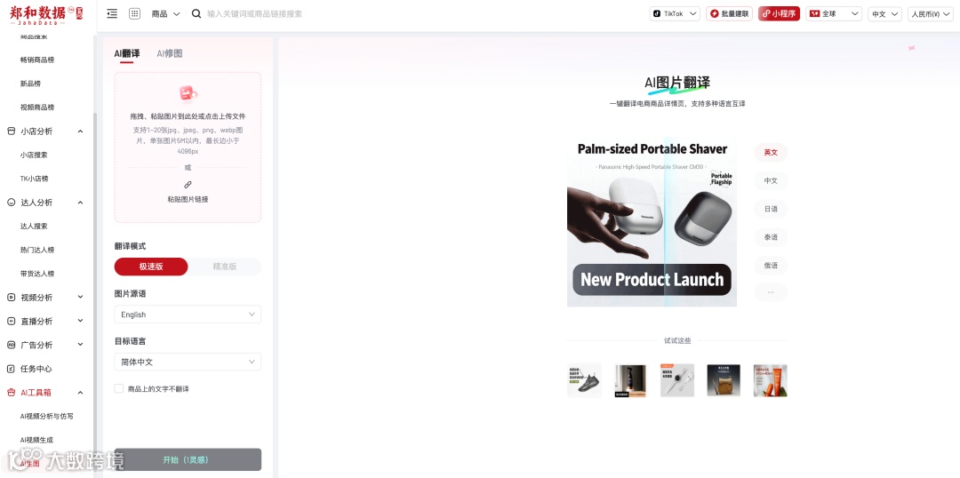 平台构建了大盘、商品、小店、达人、视频、直播六大分析板块。特色“识图搜爆款”功能,支持上传其他平台商品图,一键检索TikTok同款,快速捕捉市场趋势;配套免费达人邀约浏览器插件,支持批量定向邀约,每日可免费触达500位达人,智能筛选能力显著优于平台原生工具,0门槛上手,大幅提升建联效率。