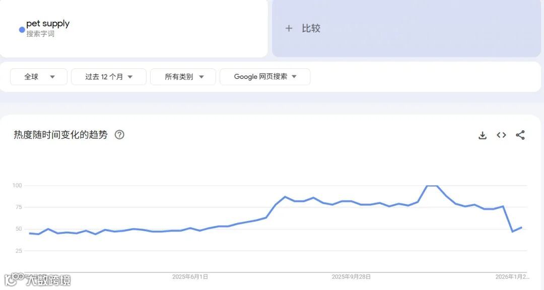 欧美市场是全球宠物经济的核心,其中美国为全球最大宠物消费国,产业链成熟度领先。谷歌趋势显示,“pet supply”(宠物用品)全球搜索热度维持在44–100区间,美国位居搜索热度榜首,市场需求强劲。