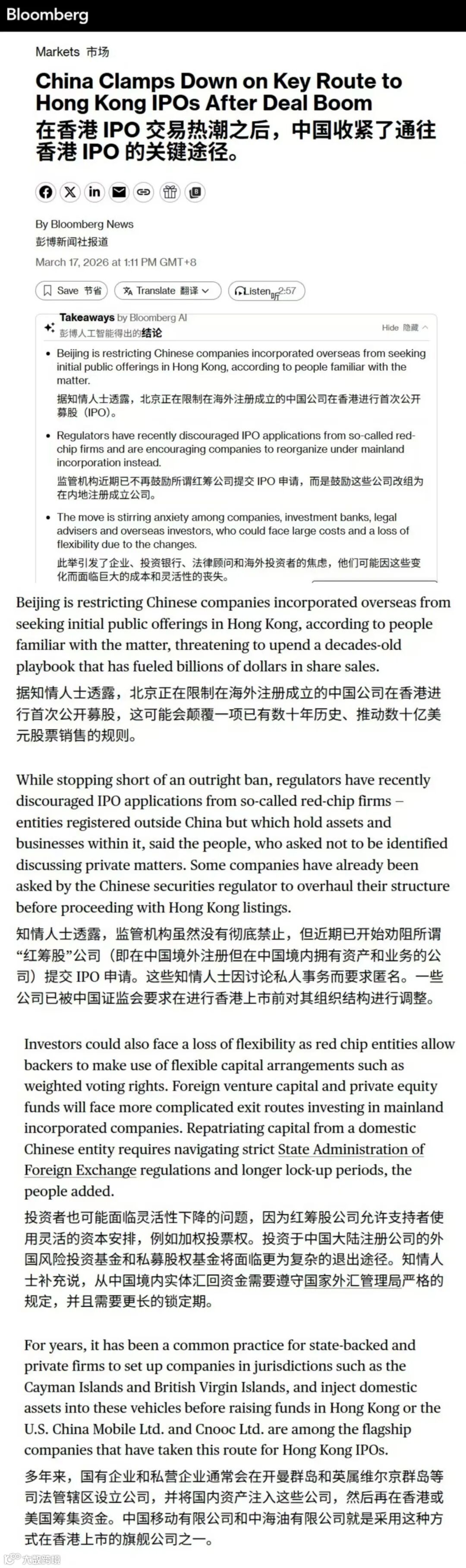 当地时间3月17日(星期二),彭博社援引多位知情人士消息发布报道,披露中国监管部门针对中资企业赴港上市的最新监管导向。据知情人士透露,近期监管层正密集与多家拟赴香港上市企业开展专项沟通,明确给出核心建议:相关企业主动拆除现有红筹架构,转而以境内合法经营主体为载体,正式申请香港上市;若企业执意保留红筹架构推进境外上市流程,必须向监管层完整解释、充分举证该架构设置的核心必要性,无法提供合理、充分依据的,将难以通过后续境外上市相关合规审核。