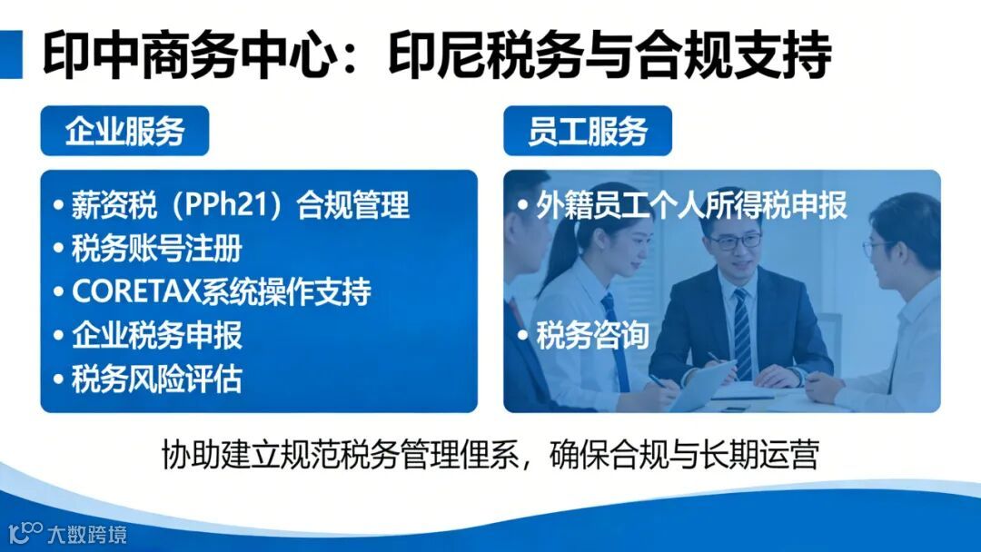 作为长期服务中资企业的专业机构,印中商务中心为企业及外籍员工提供系统化的印尼税务与合规支持,包括: