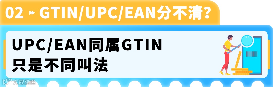 补充提醒:除了UPC(GTIN-12)、EAN(GTIN-13),GTIN还有两个细分类型,卖家简要了解即可:GTIN-8(8位数字,用于小尺寸商品)、GTIN-14(14位数字,用于定量非零售商品(如包装箱),变量非零售商品(如散装肉类)等)