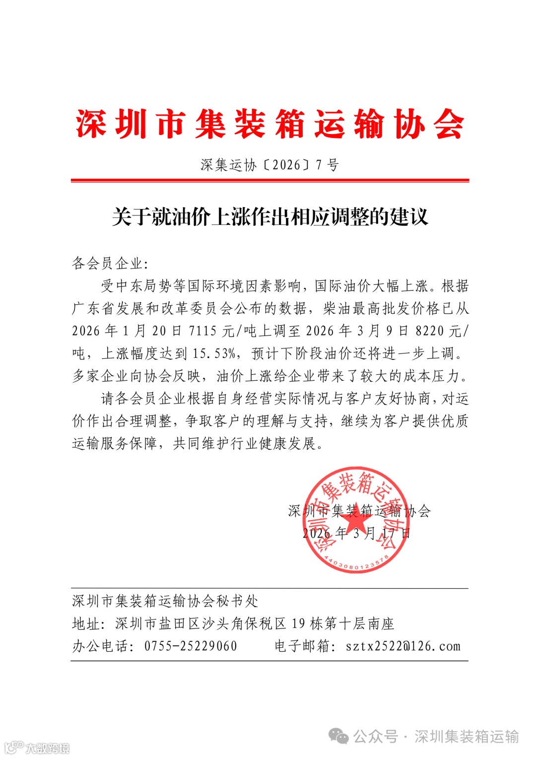 昨天(3月17日),深圳市集装箱运输协会发布《关于就油价上涨作出相应调整的建议》,委婉表达了鉴于目前油价短期大幅上涨,拖车企业面临严重成本上涨压力,进而希望会员企业上调拖车费用,并希望广大货主货代企业给予理解支持。
