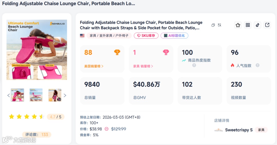 小钛发现近期一个中国家具出海品牌 Sweetcrispy,凭借一张单价200多元的沙滩椅,在TikTok美区杀出重围!上线14天,卖出近万单,总GMV突破268万元,直接把粉色款卖到断货。原本以为是“科技杰作”,乍一看原来这张椅子多设计了一个洞,那它到底有什么魔力呢?