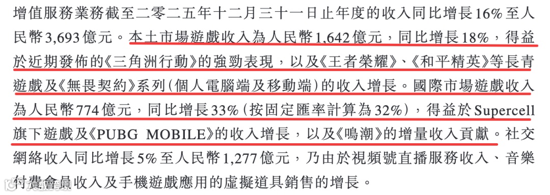更值得注意的是结构变化:2025年本土市场游戏收入1642亿元,同比增长18%;国际市场游戏收入774亿元,同比增幅达33%。