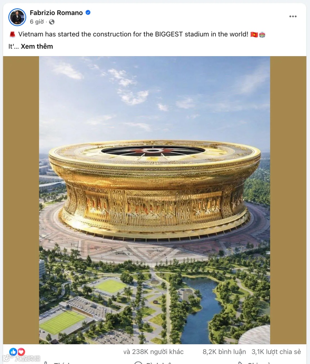 法布里齐奥・罗曼诺发布的铜鼓体育场相关动态,收获了超 20 万次点赞。