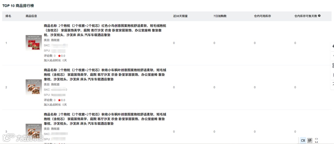 页面下方同步展示TOP10商品排行榜,可查看每款商品的完整信息、近30天销量、7日加购数、仓内可用库存、仓内库存可售天数等详细数据,方便你快速分析商品表现,制定后续运营策略。