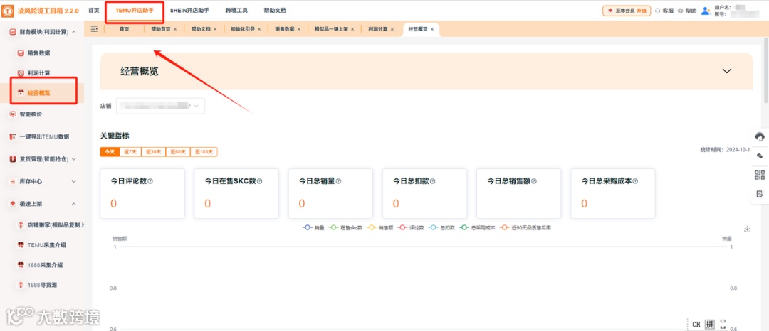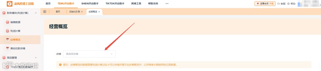 打开已安装好的凌风跨境工具箱插件,在插件左侧菜单栏找到【财务模块】,点击下拉选项中的【经营概况】,进入经营概览专属页面。
