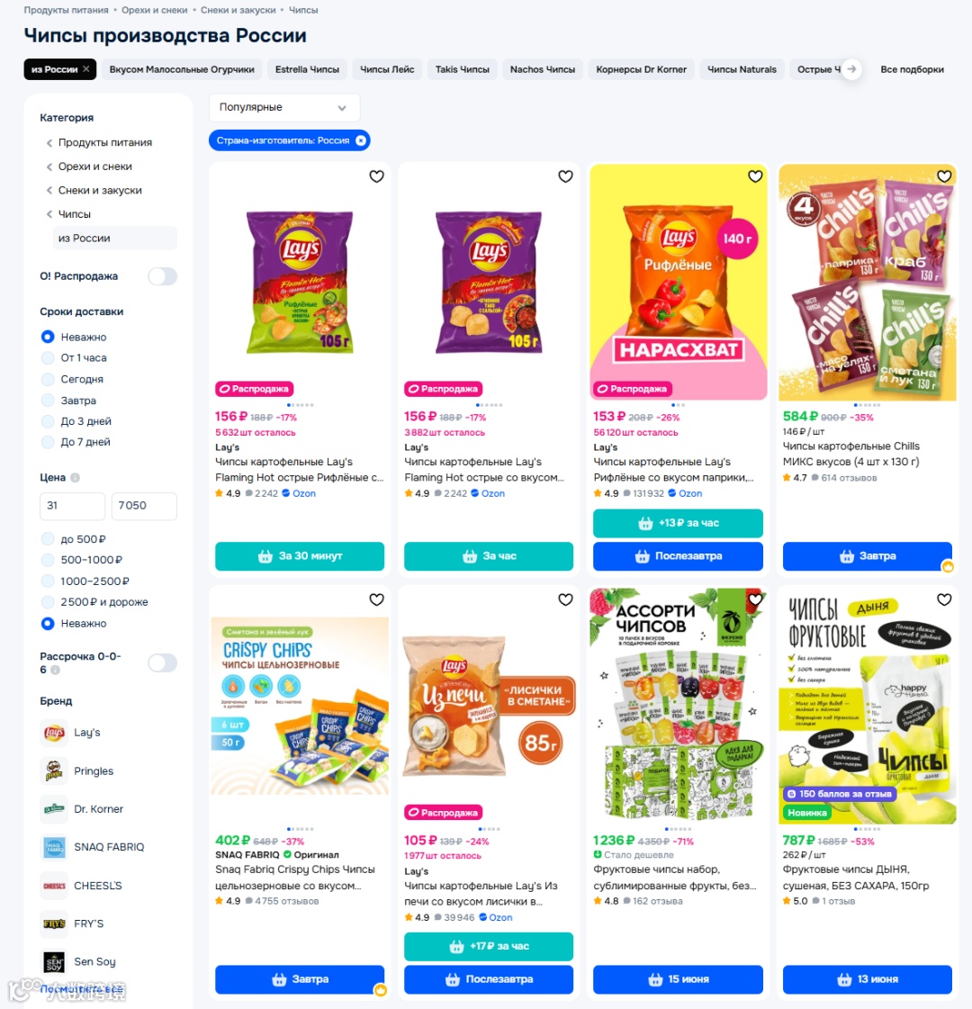 此外,国际品牌与本土品牌共同主导市场格局。百事旗下Lay’s、Cheetos仍占据领先地位,本土品牌如Русская картошка、Московский картофель表现亮眼。值得注意的是,因制裁影响,品客薯片已被中国来源的产品部分替代。