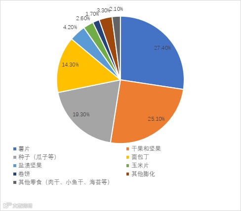 传统品类如薯片仍占主导地位(占比27.4%),但麦片棒、健身棒以及坚果、干果等健康类产品也呈现强劲上升趋势。