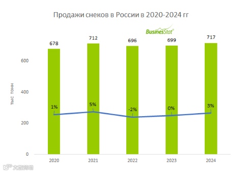 零食是俄罗斯食品行业最活跃的细分领域之一。由于产品便于食用且口味多样,消费需求稳定增长。2024年俄罗斯零食销量同比增长3%,总量达71.7万吨,成为FMCG行业中增长最快的类目。