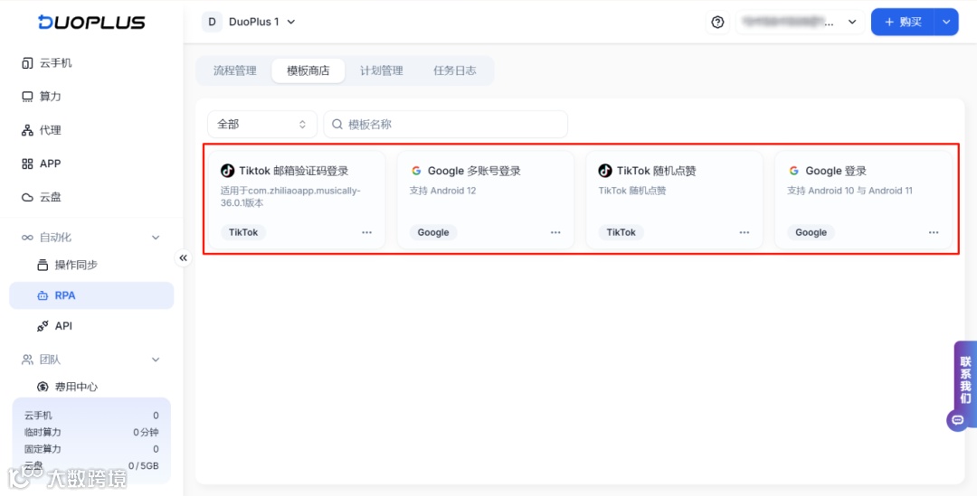 DuoPlus云手机一直努力为用户提供更方便、更高效率的跨境工具,本次在自动化列表中新增RPA功能,包括流程管理、模板商店、计划管理、任务日志四个栏目。