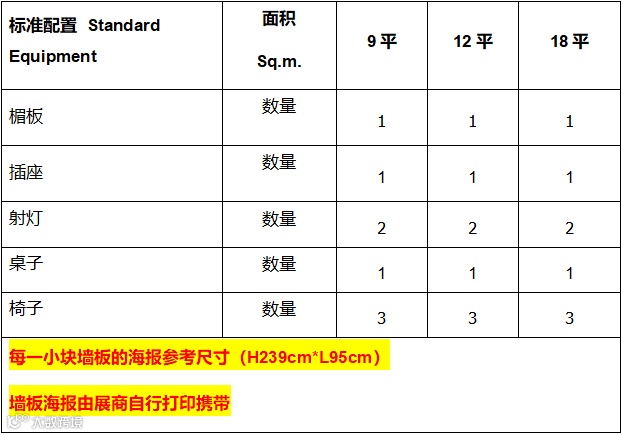 4、展览区公共区域标准:展览大厅内不得使用任何标志、牌匾或其他形式的广告,或固定在展览的墙壁或柱子上。未经同意,不得在会议室、注册或展览区分发任何出版物。