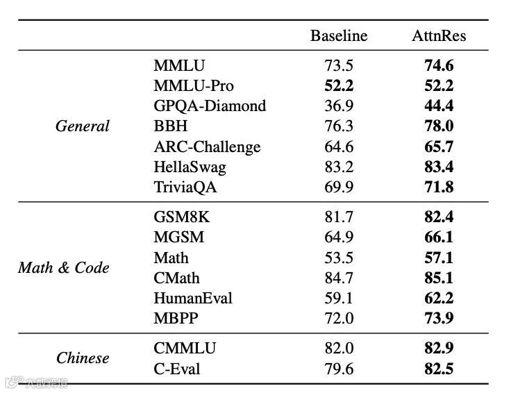 训练效率提升 25%:同等计算预算下,Attention Residuals 能获得更好的下游性能;反过来说,达到相同性能需要的训练计算量减少了约 20%,相当于获得了 1.25 倍的效率优势