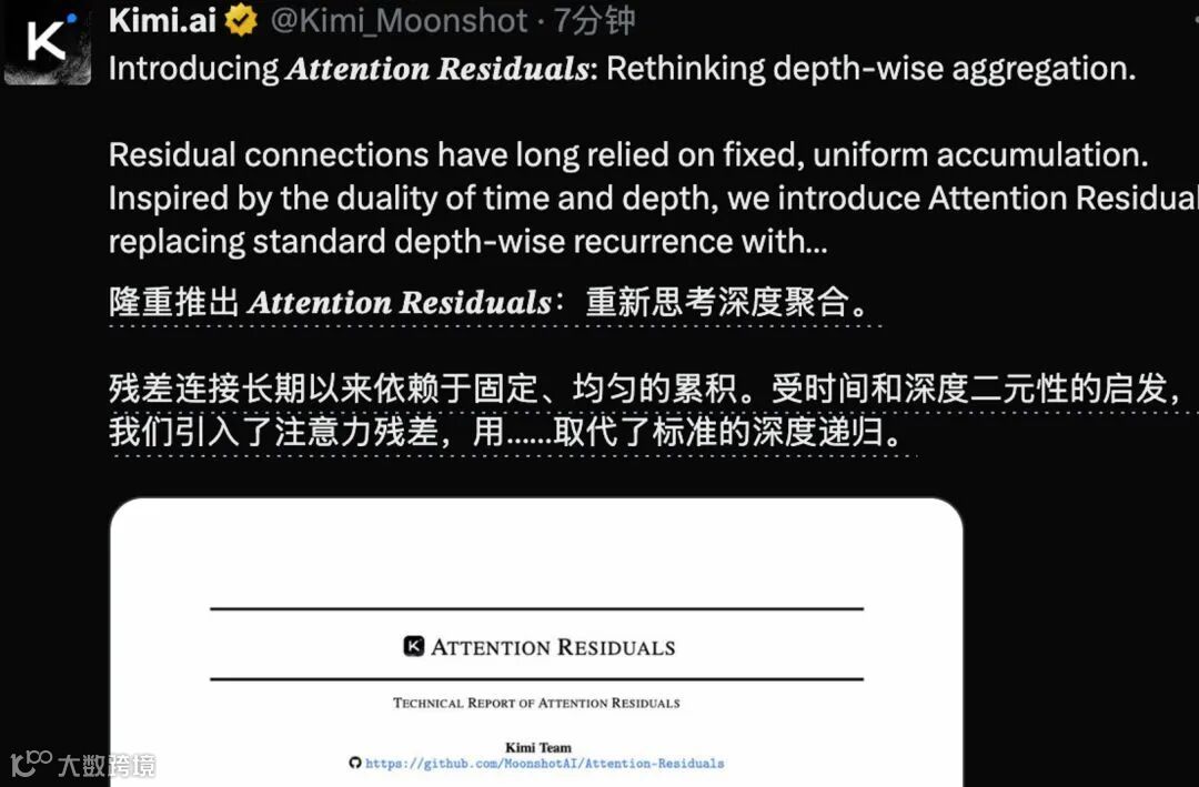 马斯克在 X 上转发这篇论文时,只用了两个词:“Impressive work from Kimi”(Kimi 的令人印象深刻的工作)。