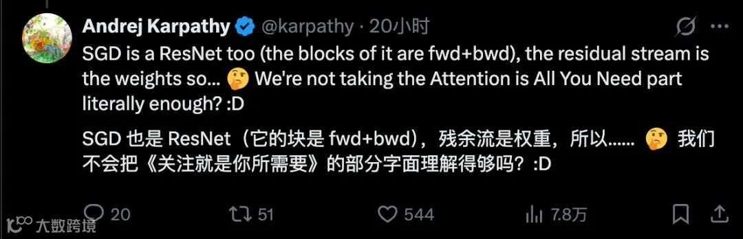 Karpathy 的评论也很有深意:我们对 Transformer 开山之作的理解还不够深刻。这暗示着,即使是最经典的架构,仍然有巨大的优化空间。