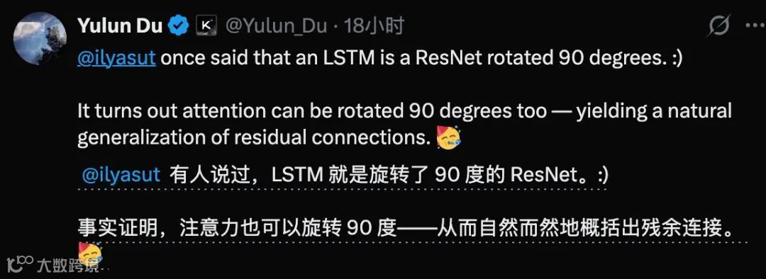 Ilya 曾经提出过一个有趣的观察:如果把按时间先后顺序处理数据的 LSTM 网络“旋转 90 度”,也就是把时间轴换成模型深度轴,就变成了现在的残差网络(ResNet)。