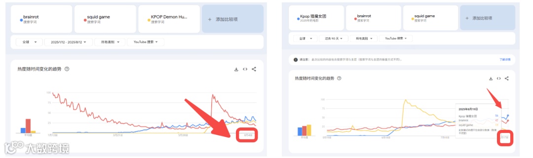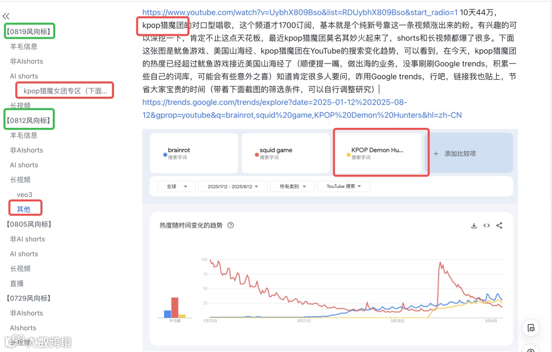 不是吹牛,这是 2025 年 8 月初,我们在 YouTube 深海圈社群【风向标】发布的有关 kpop 猎魔女团的最早记录,分别在【0812】和【0819】,连发两周;最早的 Google trends 截图是【 0804】。