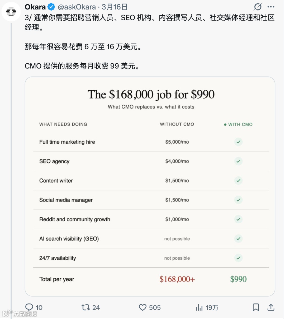 Okara 还给了一张对比图,正常招聘这些营销人员一年就要十几万美金,现在AI CMO一个月只需要99美金。