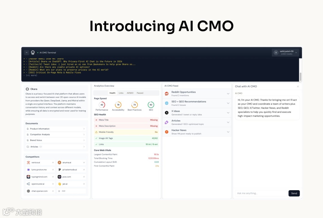 所以 Okara 直接做了一个AI CMO,用几个Agent帮你做营销。