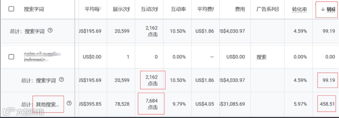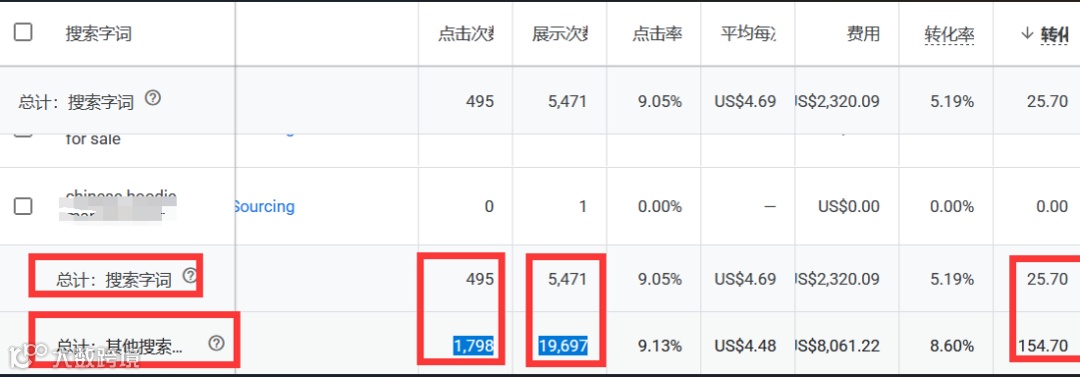 :如果你使用了广泛匹配或词组匹配,你的广告可能会被大量相关的、不相关的或长尾的搜索词触发。这些低流量的长尾词正是“others”的主要来源之一 。 - 搜索合作伙伴网站流量