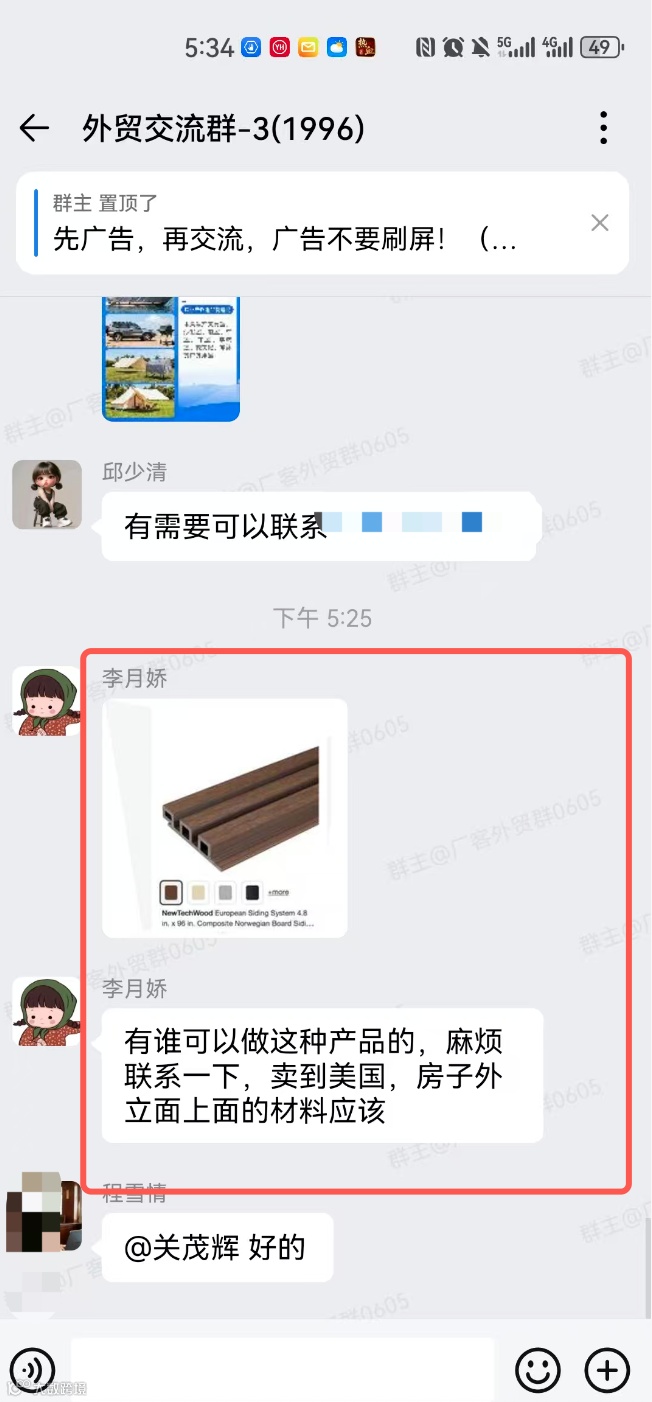 有采销需求的外贸从业者可加入行业交流群。群内支持发布外贸采购、产品销售信息,形式包括文字、图片及视频;请遵守群规,避免高频广告与刷屏行为。