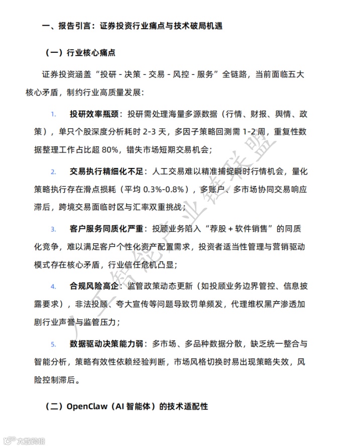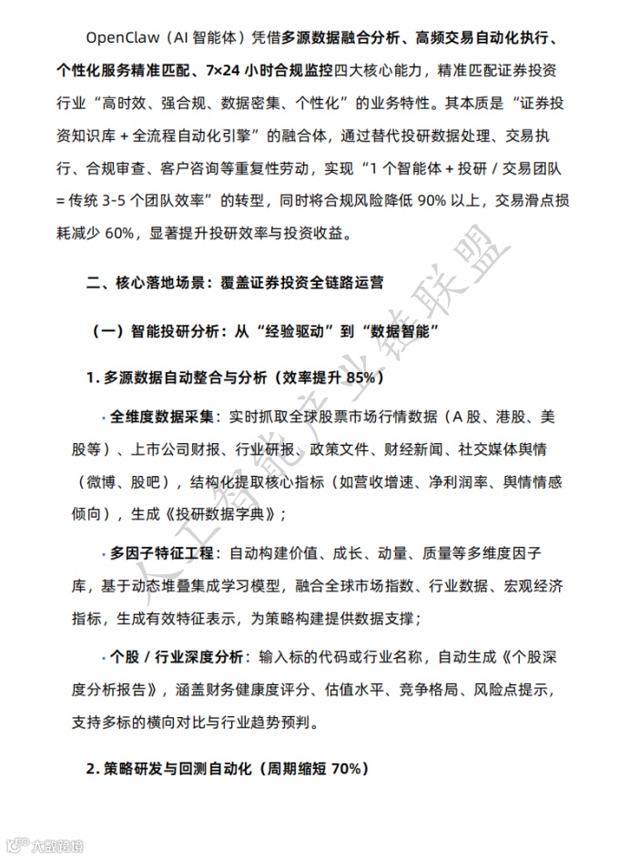 OpenClaw(AI智能体)聚焦证券投资行业“高时效、强合规、数据密集、个性化”特性,具备多源数据融合分析、高频交易自动化执行、个性化服务精准匹配、7×24小时合规监控四大能力。