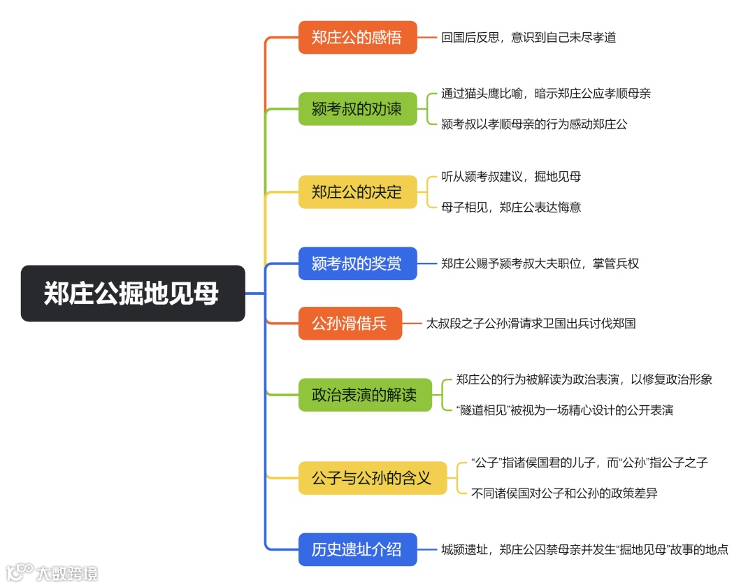 本文主要讲述郑庄公在颍考叔劝谏下,以“掘地见母”方式与母亲武姜和解,修复政治形象;以及太叔段之子公孙滑向卫国借兵讨伐郑国的历史事件。