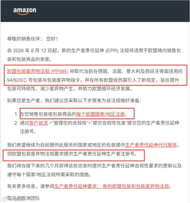 亚马逊已发布紧急公告,明确要求德国、法国、意大利、西班牙、比利时、荷兰、爱尔兰、波兰、瑞典等9大核心站点卖家,必须完成包装生产者责任延伸(EPR)合规注册;未提交有效EPR注册号的商品将被直接下架,无缓冲期。