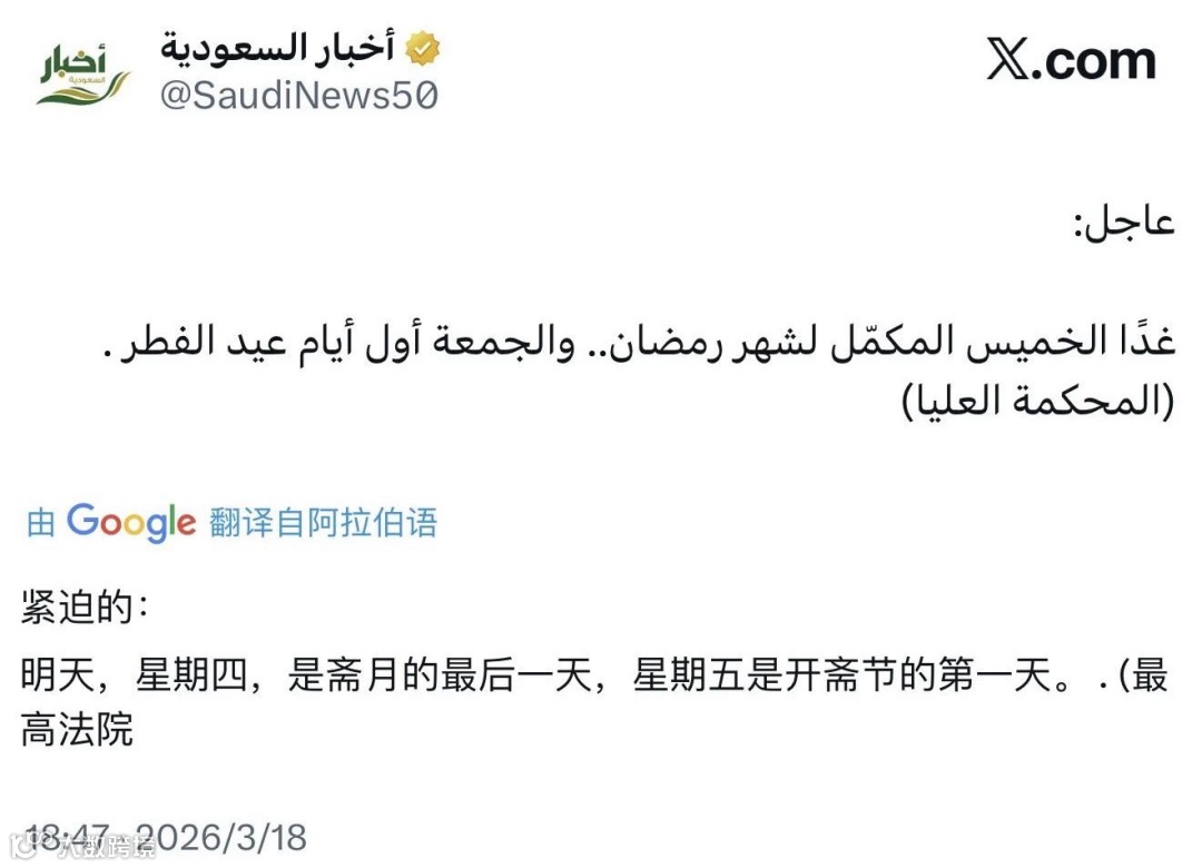 据沙特最高法院观月结果,3月18日晚在沙特全境均未能观测到新月。依据伊斯兰教历“见月封斋、见月开斋”及“补满30天”原则,斋月将完整持续30天,3月19日为斋月最后一天,穆斯林仍需履行封斋义务。